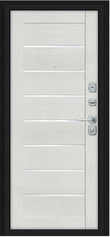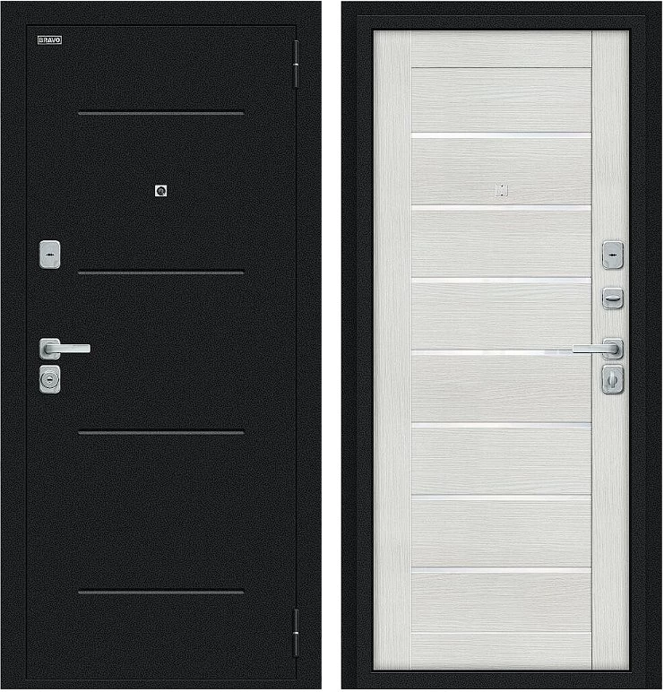 Надежная входная Дверь Браво Техно/BChrome Букле черное/Bianco Melinga премиум класса по цене 34 507 руб. Большая толщина стали защитит от проникновения в ваш дом, квартиру или коттедж. Используется очень качественная фурнитура: замки, цилиндры, ручки, защелки. Покрытие и отделка двери изготовлено под внимательным контролем производителя. Дверь имеет долгий срок службы и гарантию.
